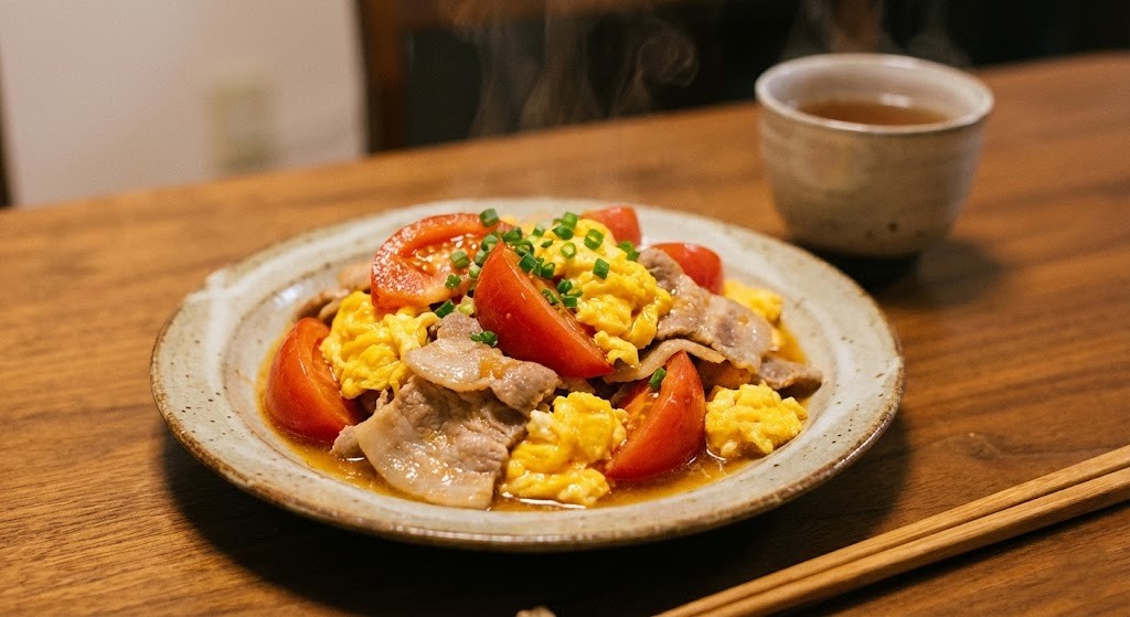 🍳 今夜の献立:豚肉とトマトのふんわり卵炒め