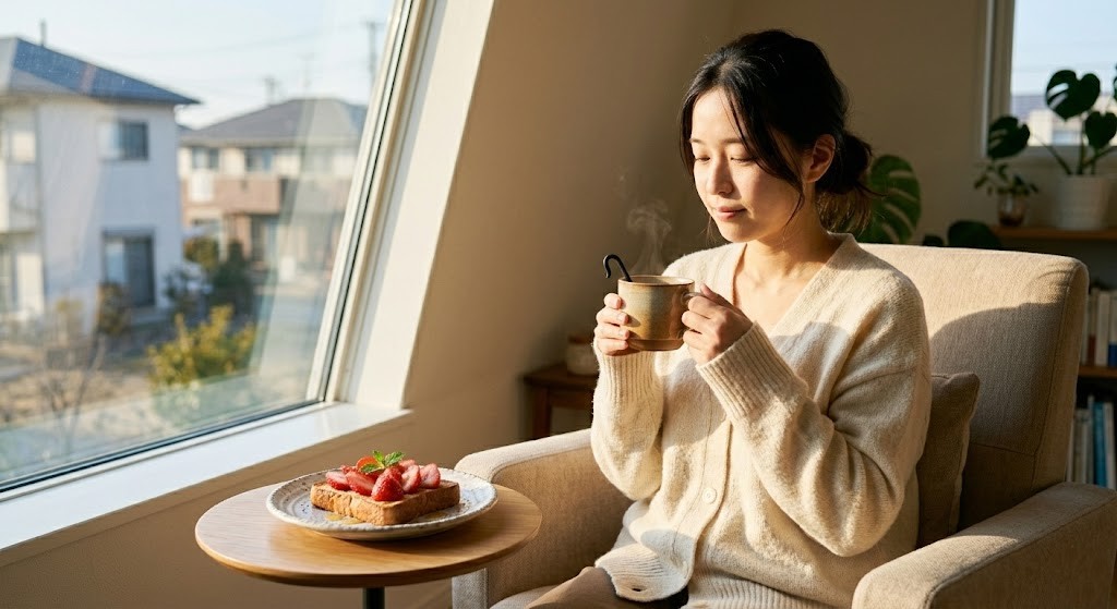 ソファに座り、まずは紅茶を一口。 まろやかで、茶葉の良い香りだけがスッと鼻に抜けていく。そして、いちごのトーストを頬張る。 サクッとしたパンに、クリームチーズの濃厚なコクといちごの甘酸っぱさが絶妙に絡み合い、口の中いっぱいに春が弾けた。