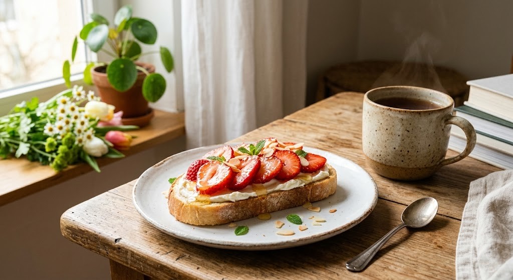 🍳 休日のゆったり献立:春を味わう、いちごとクリームチーズのオープントースト