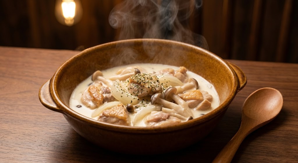 🍳 今夜の献立:心温まる、鶏肉としめじのクリーム煮