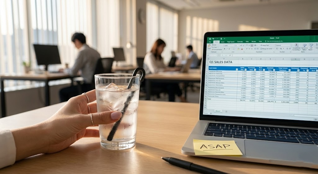 目がシパシパしてきたところで、デスクの上のタンブラーに手を伸ばす。 中には冷たいお水と、マイボトルの相棒「アイアンステッキ」。 ただお水に入れておくだけで鉄分が溶け出すこのスティック。Amazonで見つけて以来、オフィスでの水分補給に欠かせない存在になっている。最近は楽天でも買えるみたいなので、春から一人暮らしを始める後輩にも「これ、ズボラでも続くからいいよ」と勧めてみようかな。 冷たい水をゴクリと飲み干し、再びモニターに向き直った。