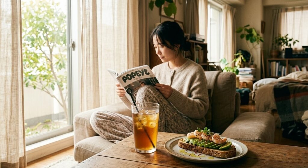 ソファに座り、まずは冷たいアイスティーを一口。 「あー、スッキリして美味しい」 そして、アボカドトーストを頬張る。クリーミーなアボカドとプリプリのエビ、そしてマヨネーズの酸味が、カリカリのトーストと見事にマッチしている。