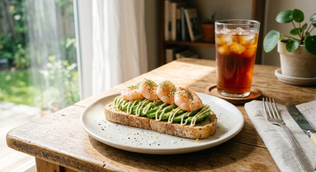 🍳 休日のゆったり献立:カフェ気分!アボカドとエビのオープンサンド
