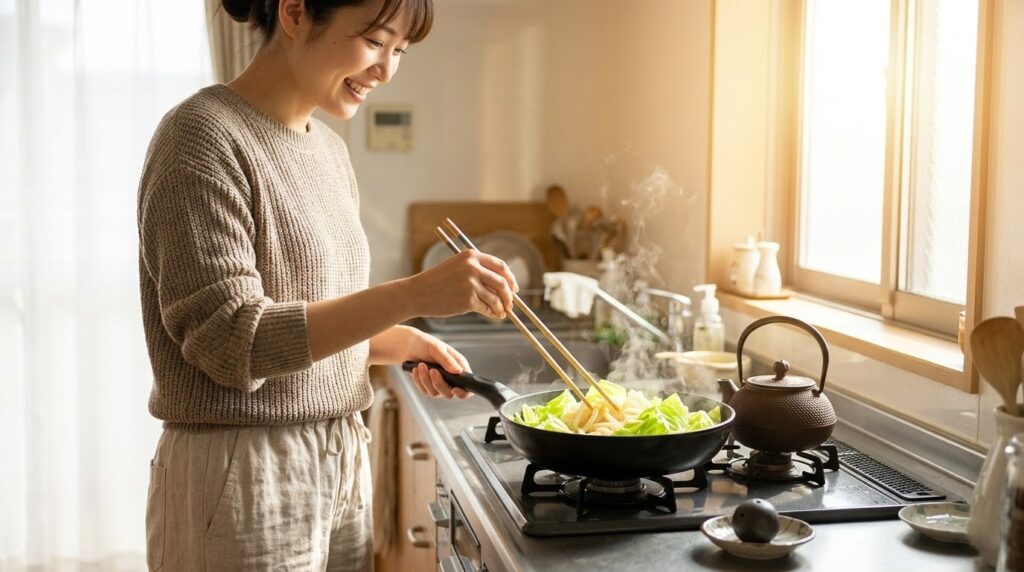 スープの準備ができたら、フライパンで豚肉と春キャベツを炒める。 そこへ、レンジで解凍したうどんを投入。 味付けはシンプルに、お醤油とだしの素。少しだけ焦がすように炒めると、香ばしい匂いがキッチンに広がり、食欲を一気に刺激する。