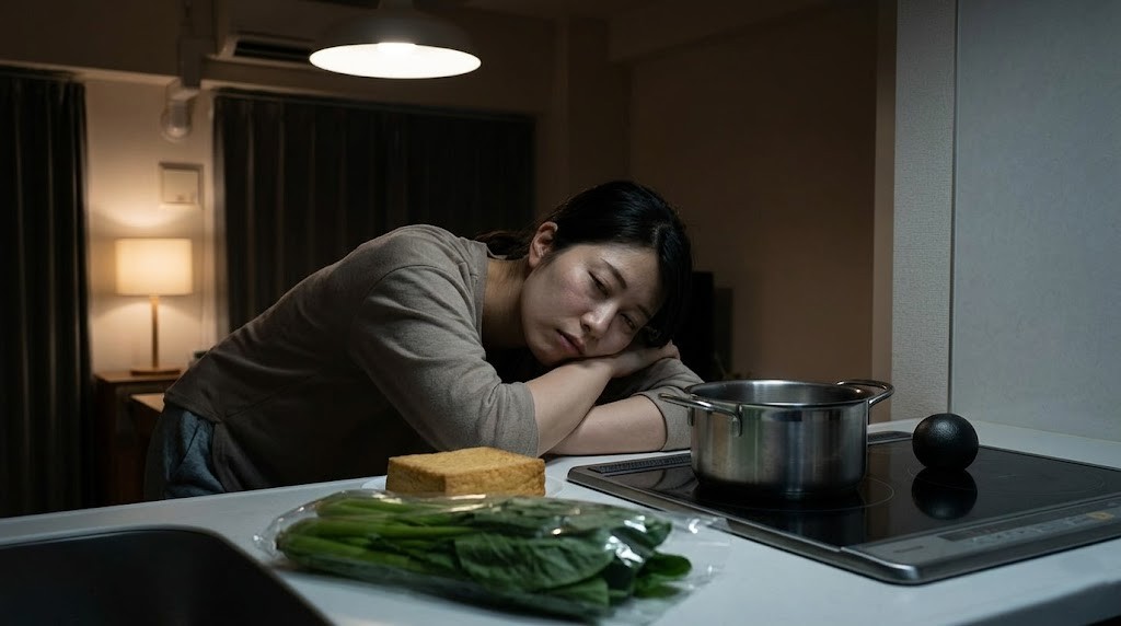 スーパーに寄る気力もなく、まっすぐ帰宅。 幸い、冷蔵庫には買い置きしておいた「厚揚げ」と「小松菜」がある。 今日はもう、お肉を焼く気にもなれない。胃腸も「とにかく優しいものを」と悲鳴を上げている。