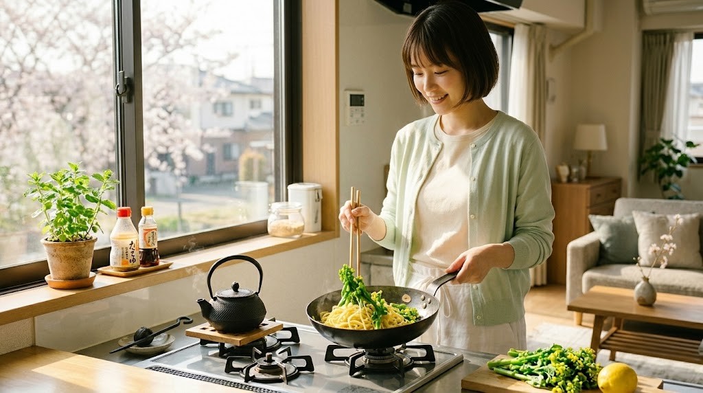 のんびりとキッチンへ向かい、冷蔵庫を覗く。 先日スーパーで見かけて買っておいた「菜の花」と、ストック棚のツナ缶が目が合った。 よし、今日のお昼は、春の苦味を味わう和風パスタにしよう。