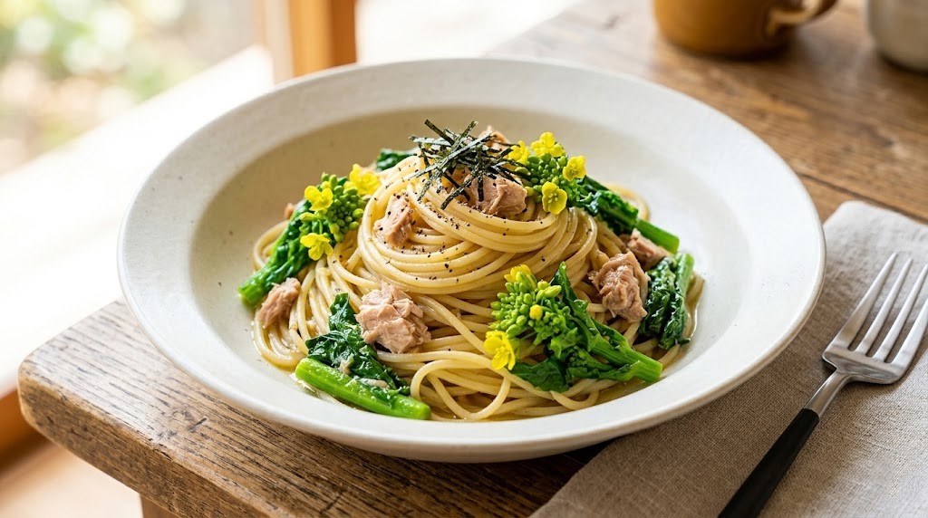 🍳 休日のゆったり献立:春のほろ苦さ。菜の花とツナの和風パスタ