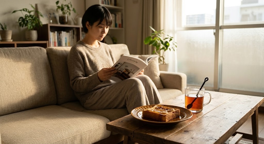 ソファに座り、まずは紅茶を一口。 まろやかで、茶葉の良い香りがスッと鼻に抜けていく。そして、バナナトーストを頬張る。 サクッとしたパンに、プリンのようにトロトロになった熱々の甘いバナナが絡み合い、口の中が幸福感で満たされる。