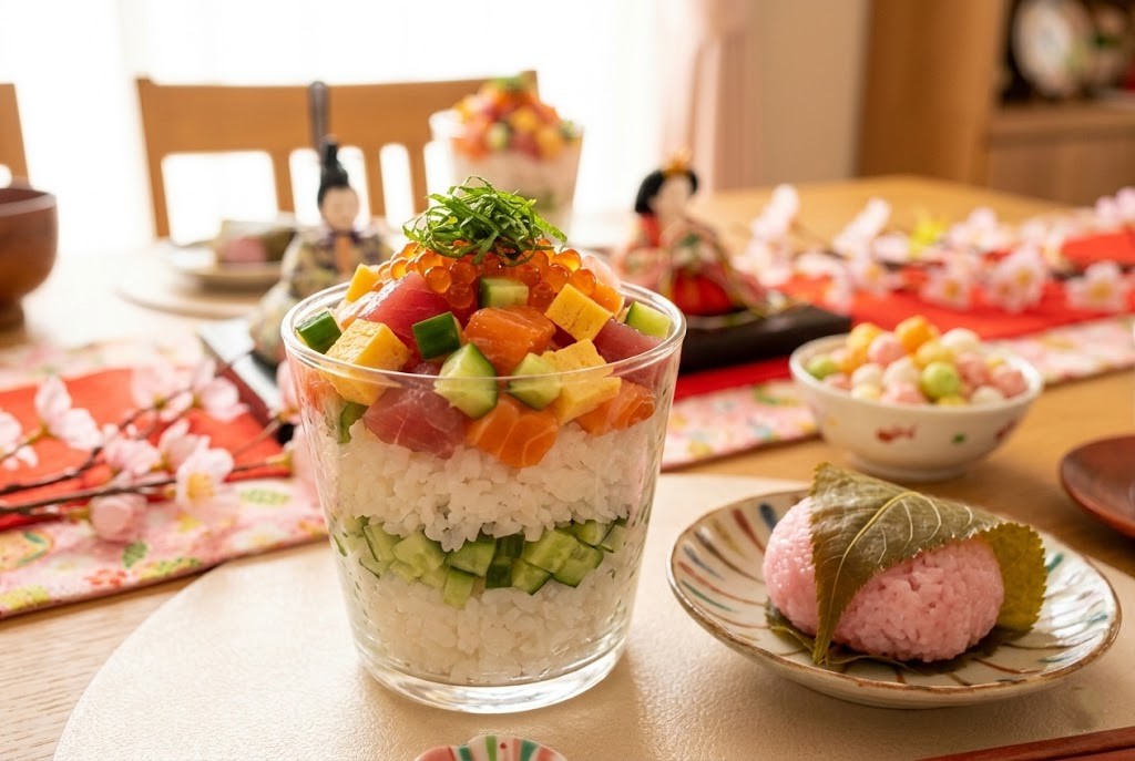 お気に入りの透明なグラスを取り出し、酢飯、きゅうりの角切り、酢飯……と層になるように重ね、一番上にお刺身のパックをドサッと贅沢に盛り付ける。 最後に、買ってきた桜餅をお皿に添えれば、美咲だけの小さなひな祭りパーティーの開幕だ。