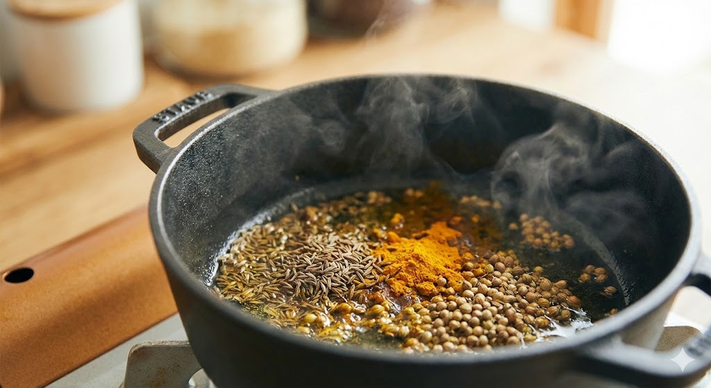 カレーに含まれるクミンやターメリックといったスパイスは、鉄分と一緒に調理されることで香りがより立ちやすくなると言われています。また、鉄鍋から溶け出す $Fe^{2+}$(二価鉄)が、カレーの油脂分と馴染むことで、角が取れたまろやかな味わいになります。通常の鍋で作るカレーが「尖った味」に感じられるのに対し、鉄器で作ったカレーは、初日から「二日目の熟成感」があるのが最大の特徴です。