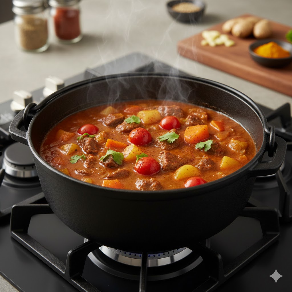 多くの日本人が愛してやまないカレー。実は、南部鉄器の深鍋や煮込み鍋で作ることで、その美味しさは何倍にも膨れ上がります。カレーにはトマトの酸味、玉ねぎの甘み、そして多種多様なスパイスが含まれていますが、鉄器の厚みがもたらす「安定した熱伝導」が、これらの複雑な素材の味を一つの深い「旨味」へと昇華させてくれるのです。