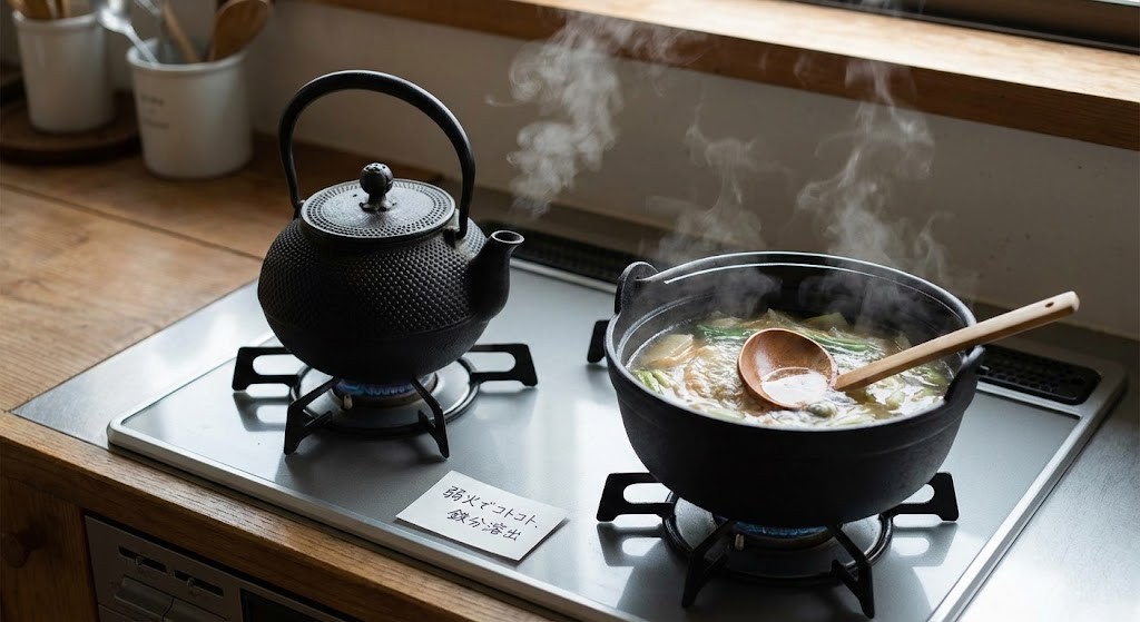 • 鉄器のダブル使い: 鉄瓶で沸かしたお湯を使って、鉄鍋で調理する。この「リレー方式」により、お湯に含まれる鉄分と、調理中に溶け出す鉄分の相乗効果が期待できます。