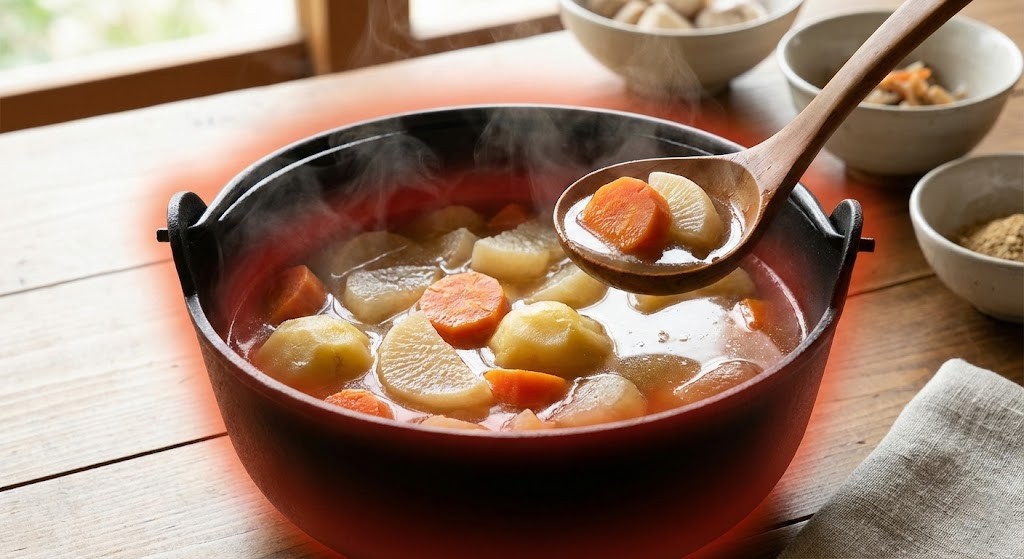 南部鉄器の最大の機能的特徴は、調理中に鉄分が「お湯の中に溶け出す」ことにあります。だとしたら、その溶け出した鉄分を余すことなく、100%回収できるメニューこそが、鉄分補給の最適解。それが「スープ」と「味噌汁」です。