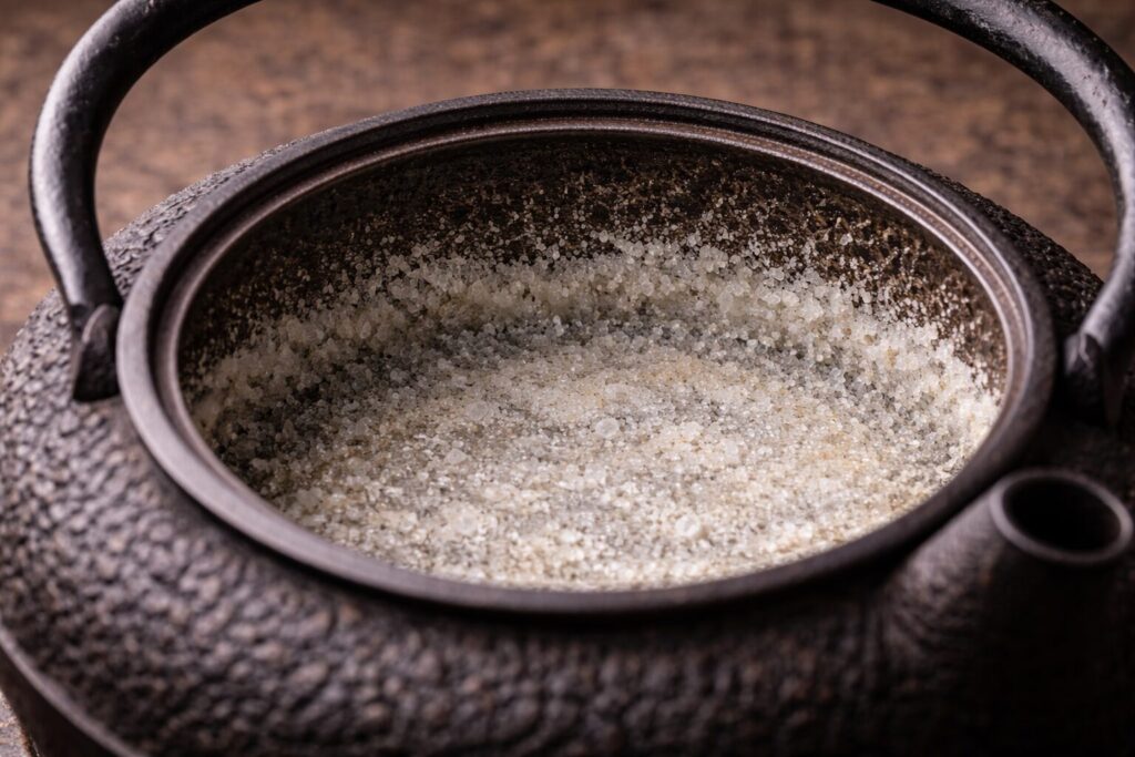 鉄瓶を使い続けると、内部に白い粉のような付着物が現れます。これを「汚れ」だと思ってこすり落としてはいけません。これは水中のミネラル分(カルシウムなど)が結晶化した「湯垢」です。この湯垢が鉄の表面を覆うことで、鉄臭さが抑えられ、お湯の味が劇的にまろやかになります。湯垢を育てることこそが、鉄瓶愛好家の到達点です。
