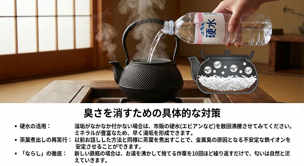 • 「ならし」の徹底: 新しい鉄瓶の場合は、お湯を沸かして捨てる作業を10回ほど繰り返すだけで、匂いは自然と消えていきます。