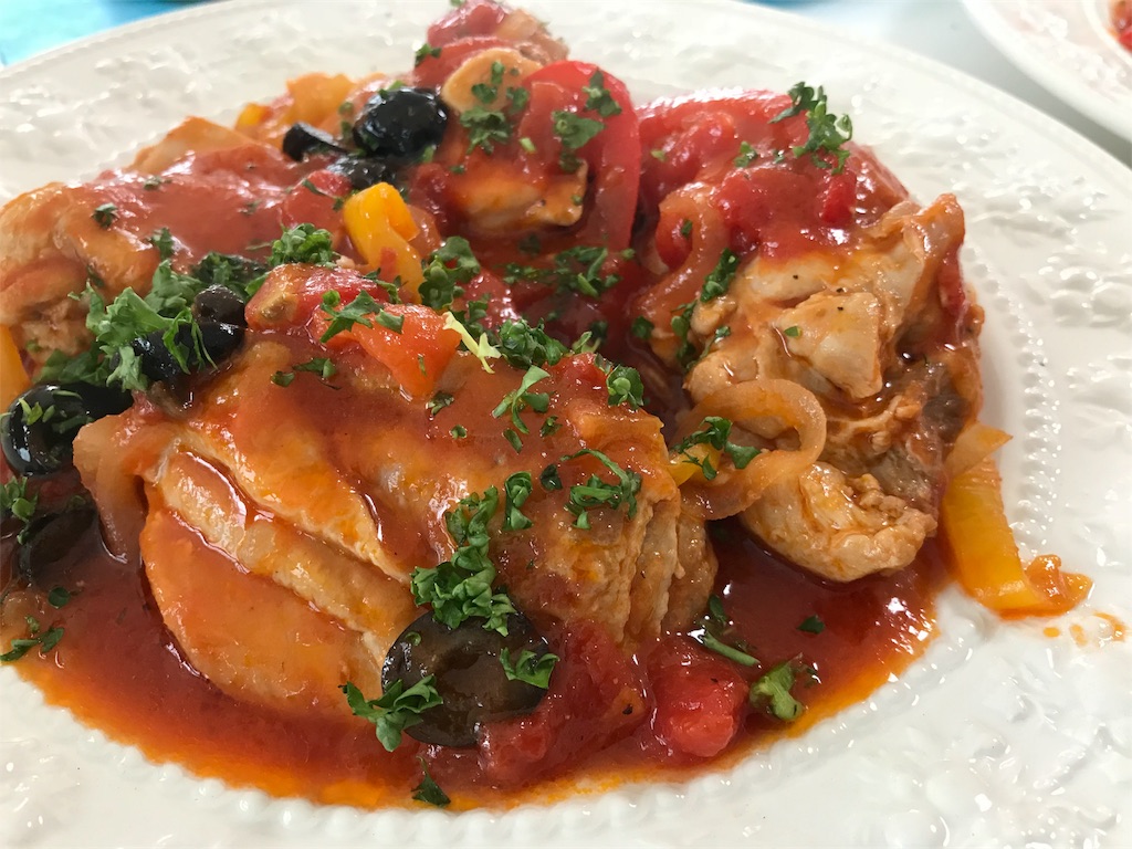 • 材料: 鶏もも肉、玉ねぎ、ナス、ズッキーニ、パプリカ、カットトマト缶、ニンニク、オリーブオイル、塩胡椒。