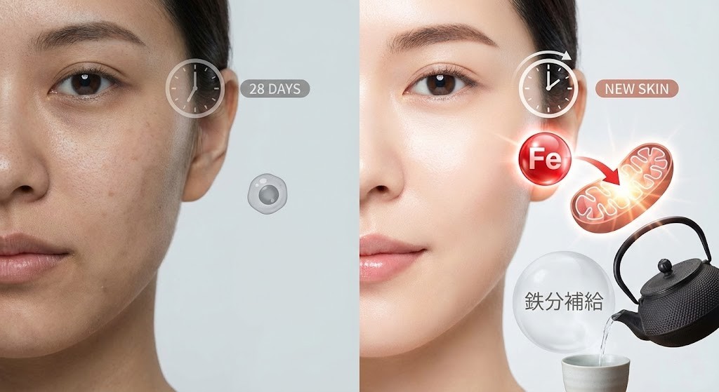 肌の生まれ変わり(ターンオーバー)には、膨大なエネルギーが必要です。鉄分は細胞内のエネルギー工場であるミトコンドリアの稼働を支えています。鉄が足りないと代謝が停滞し、古い角質やメラニンが排出されず、シミやくすみの原因となります。