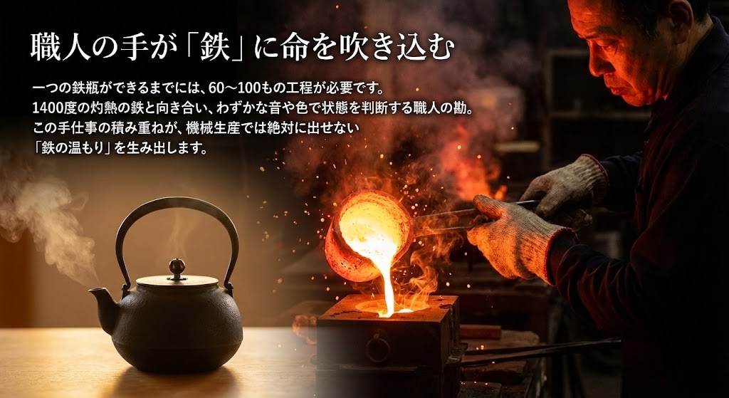 一つの鉄瓶ができるまでには、60〜100もの工程が必要です。1400度の灼熱の鉄と向き合い、わずかな音や色で状態を判断する職人の勘。この手仕事の積み重ねが、機械生産では絶対に出せない「鉄の温もり」を生み出します。