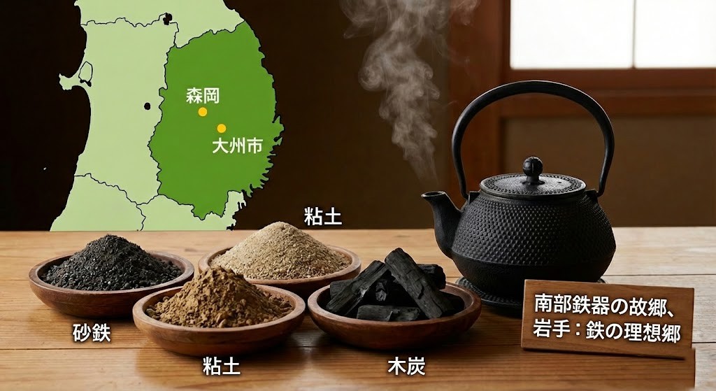南部鉄器は、岩手県の盛岡市と奥州市(旧水沢市)という二つの大きな産地で守られてきました。なぜこの地だったのか。それは、良質な砂鉄、川砂、粘土、そして鉄を溶かすための木炭が豊富に揃っていた「鉄の理想郷」だったからです。