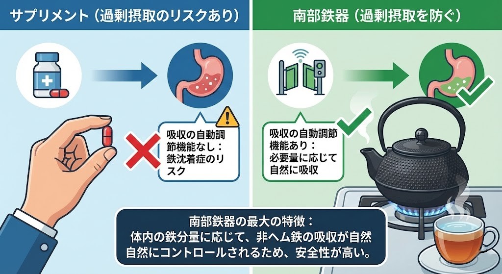 私たちの体には、食事から摂る非ヘム鉄(鉄器の鉄)の吸収を、必要量に応じて自動で調節する機能が備わっています。そのため、サプリメントで懸念される「鉄沈着症」のような過剰摂取のリスクが極めて低いのが南部鉄器の強みです。